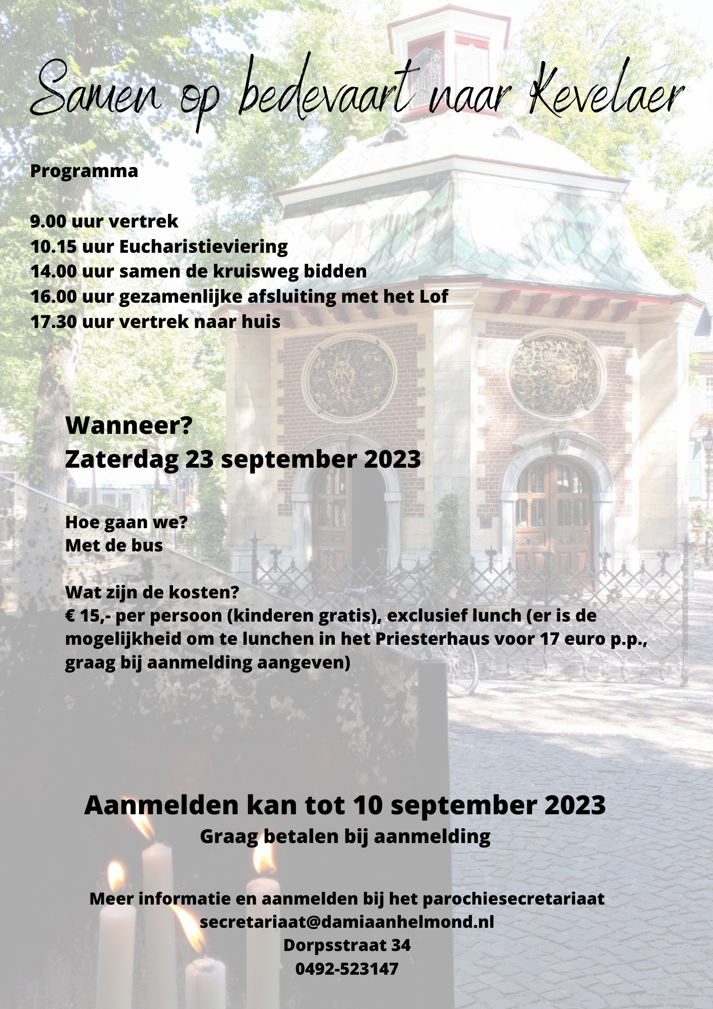 Op 23 september 2023 gaan we als parochie op bedevaart naar Kevelaer. U kunt zich nog inschrijven tot en met 10 september 2023 bij het parochiesecretariaat: